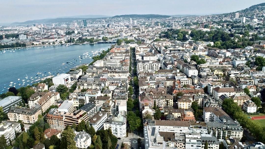 Aus der Luft betrachtet: Das gemütliche Quartier zwischen historischen Villen, grünen Strassen und dem glitzernden Zürichsee.